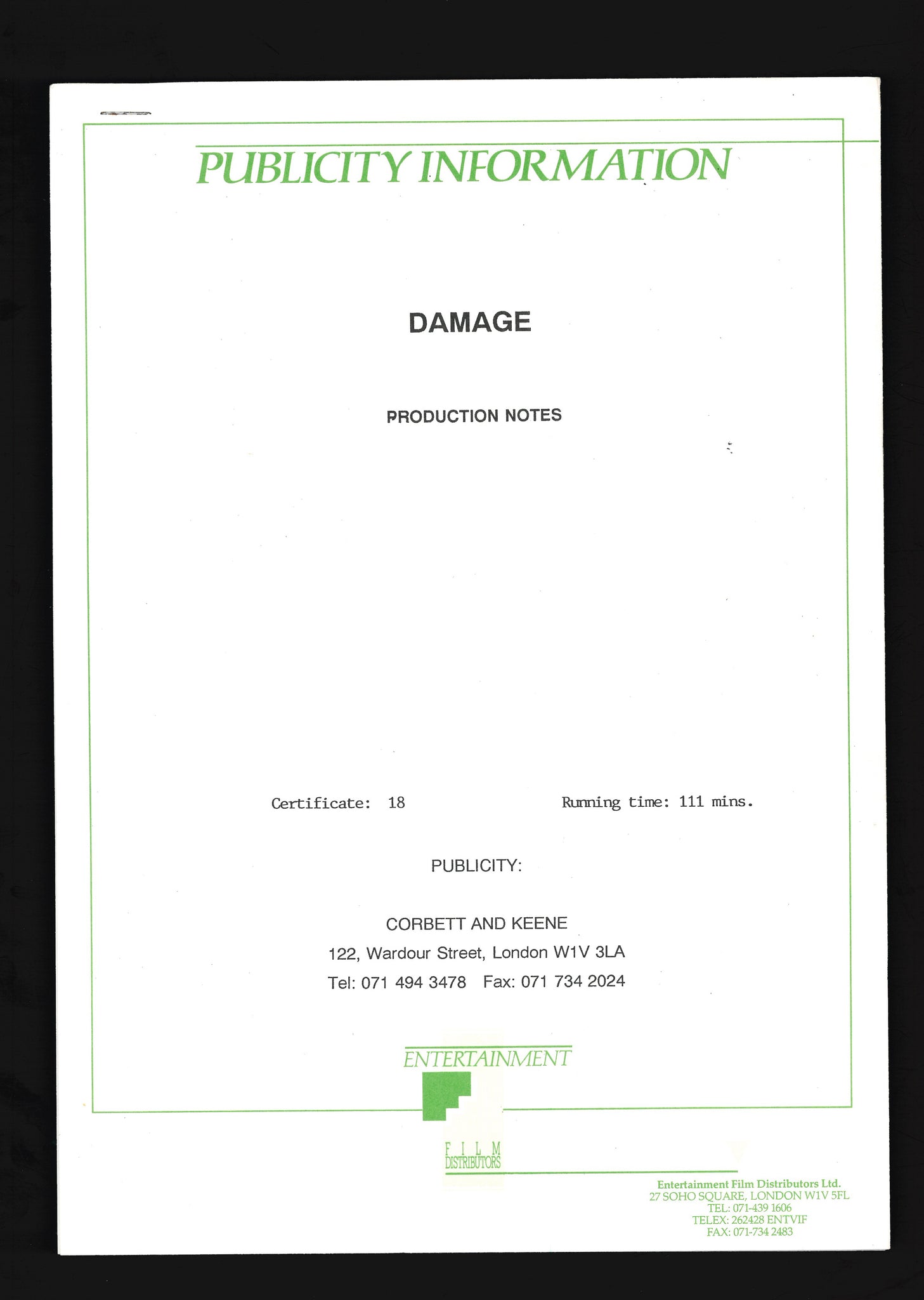 Damage, 1992 Press Kit